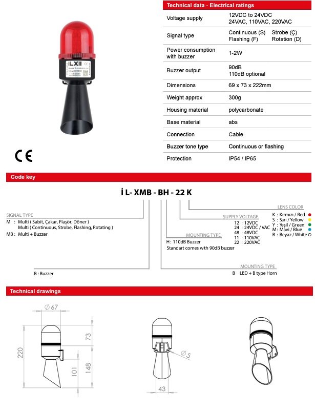 İLX 24V AC/DC Kırmızı Flaşör Multi Buzzer Borulu Korna - Ø70 B Serisi