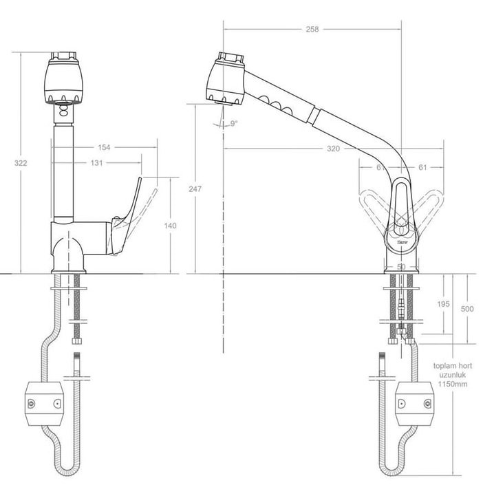 - Alt Bağlantı Aparatları 2 Adet M8 Çelik Bağlantı 3/8 50 Cm, 1 Adet M8 3/8 15 cm Çelik Bağlantı,150 cm Duş Sprali,Ayarlı El Duşu ve Ağırlık dahildir.