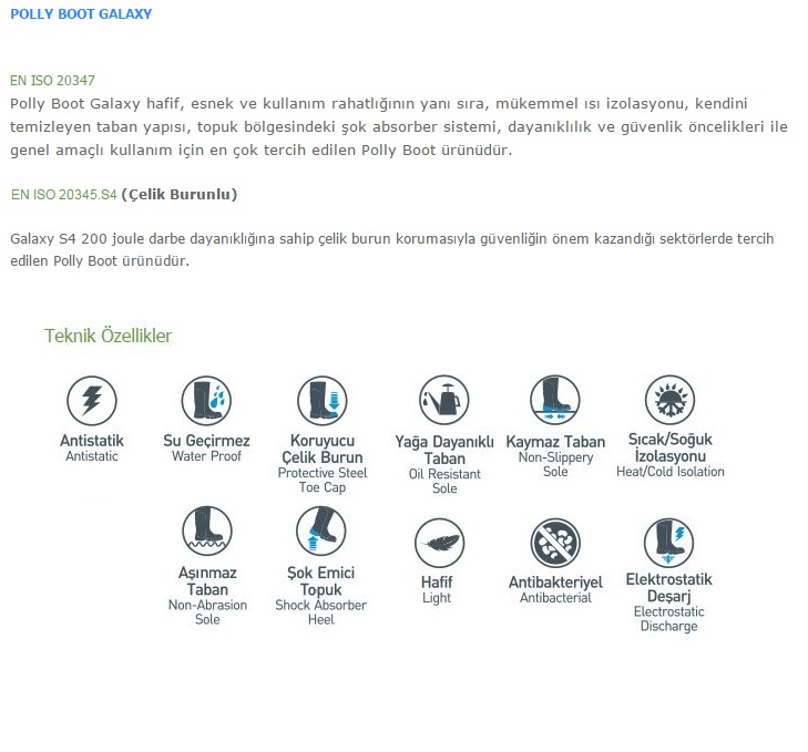 Pooly Boot İş ve Güvenlik Çizmeleri, içerdiği poliüretan maddesinin hava geçirgenliği özelliğiyle, çizmenizin içerisinde sürekli bir hava transferi sağlar. Böylece, nem ve bakteri oluşumunu engelleyip ayak sağlığınızı korur. Organik yağlar, endüstriyel yağlar ve hafif kimyasallara dirençli olan Polly Bott ürünleri, PVC ve kauçuk çizmelere oranla üç kat daha dayanıklı ve uzun ömürlüdür. Sahip olduğu koruma yastık bölgeleri, absorber darbe emici topuk ve antistatik özelliği ile ayak güvenliğinizi sağlar. Pollyboot Poliüretar Çizmeler benzerlerinden daha hafif ve daha uzun ömürlüdür. İçerdiği poliüretan maddesiyle çevre dostudur. Hava geçirgen özelliğiyle ayak sağlığınızı korur. Isı izolasyonludur.