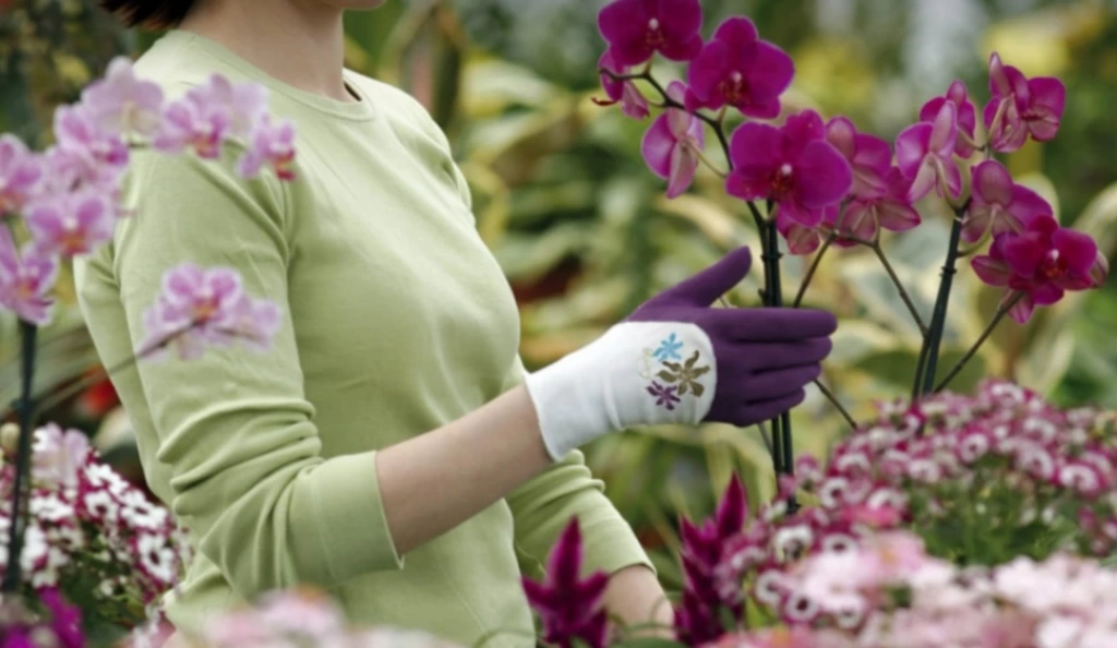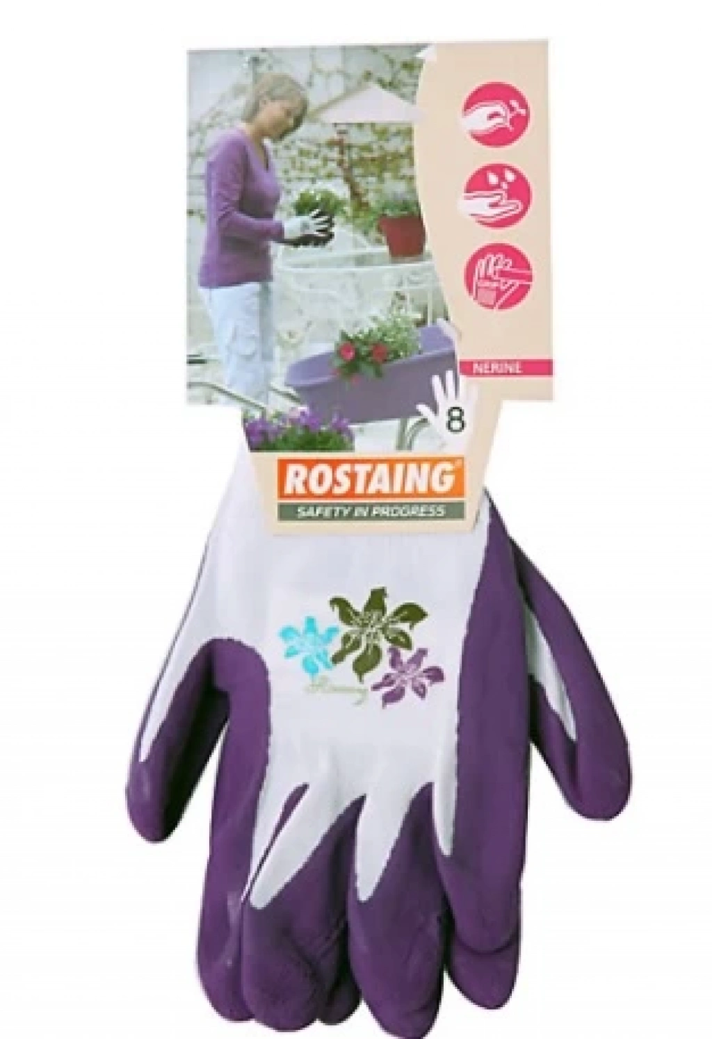 - Kaplamanın mor rengi ve çiçek desenli işaretler eldivenin kolayca görünmesini sağlar.